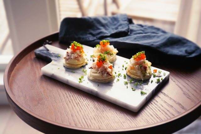 Lägg på västerbottenkrämen på smördegschipset, på med krabba, hackad gräslök och forellrom.